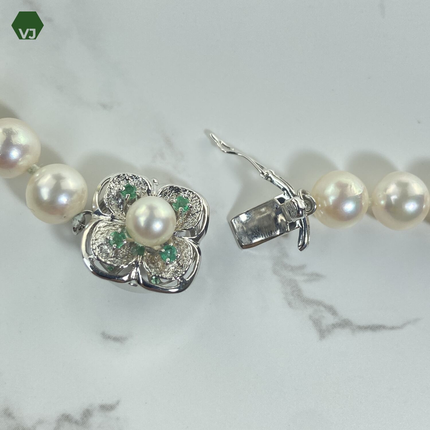 上質なアコヤパールを連ねた、気品あふれるK14YG製ネックレスです。パールは直径約7.3㎜とほど良いサイズ感で、柔らかく美しいテリを放ちます。金具部分にはエメラルドがあしらわれ、さりげないアクセントとして華やかさを添えています。クラシカルで上品な雰囲気を持ち、フォーマルシーンから日常のお洒落まで幅広く活躍するジュエリーです。