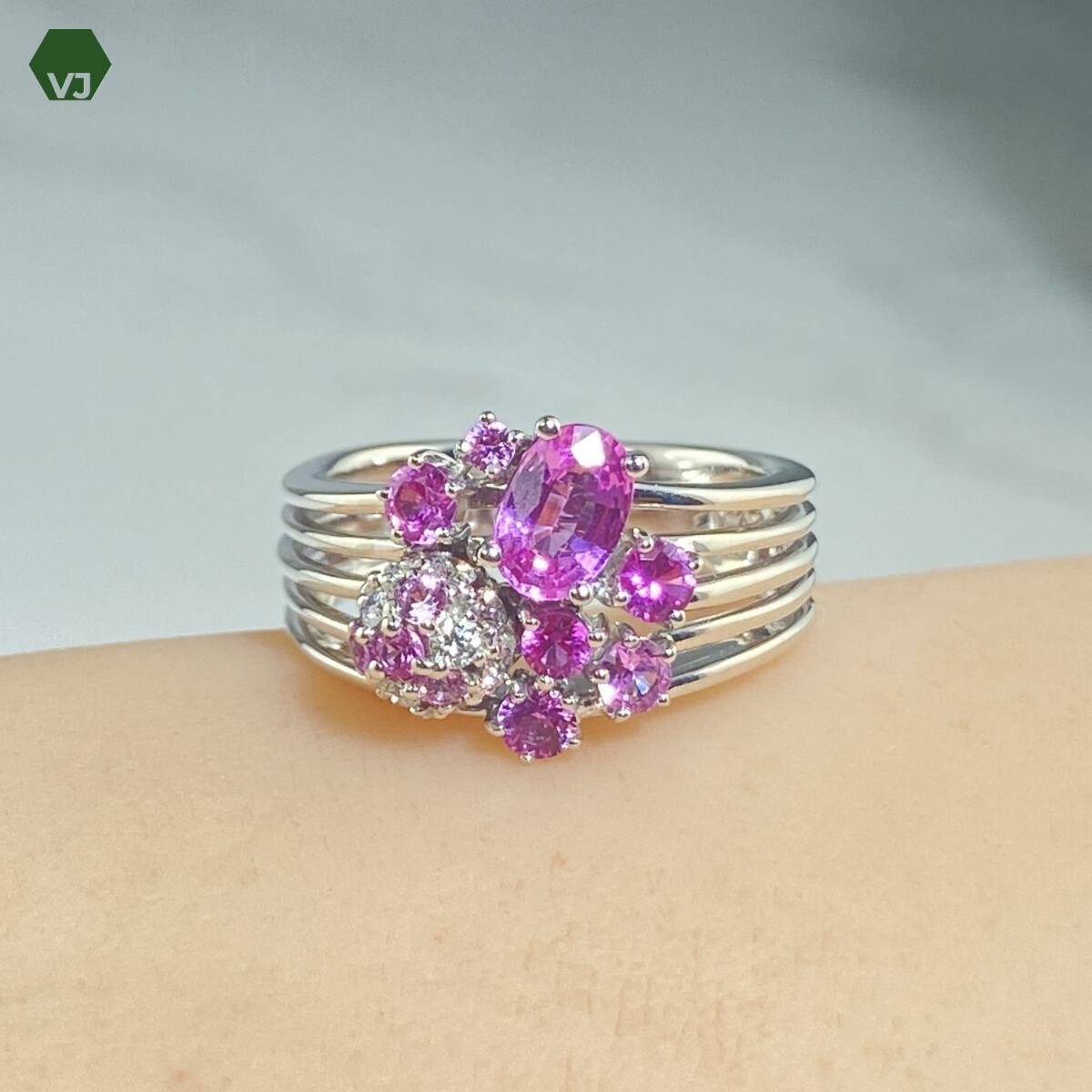 異なるサイズのピンクサファイアを立体的にセッティングし、フラワーモチーフのように重なり合う表情豊かな仕上がりとなっています。