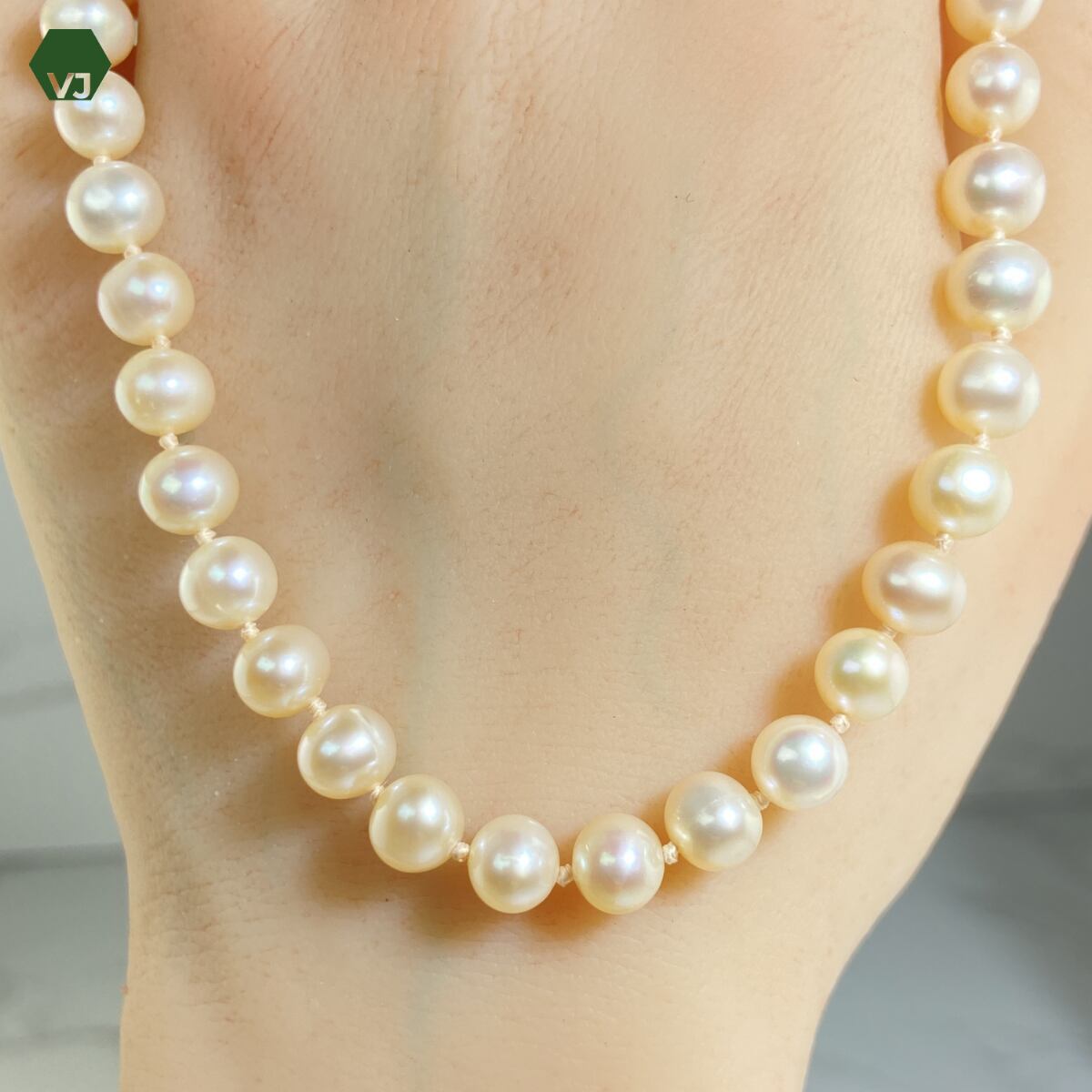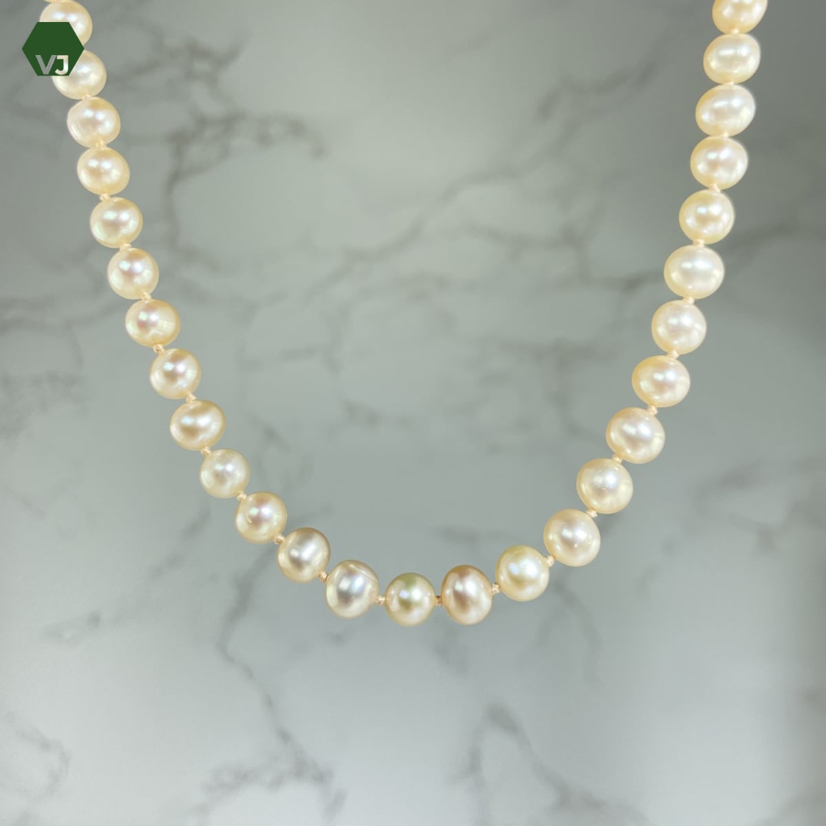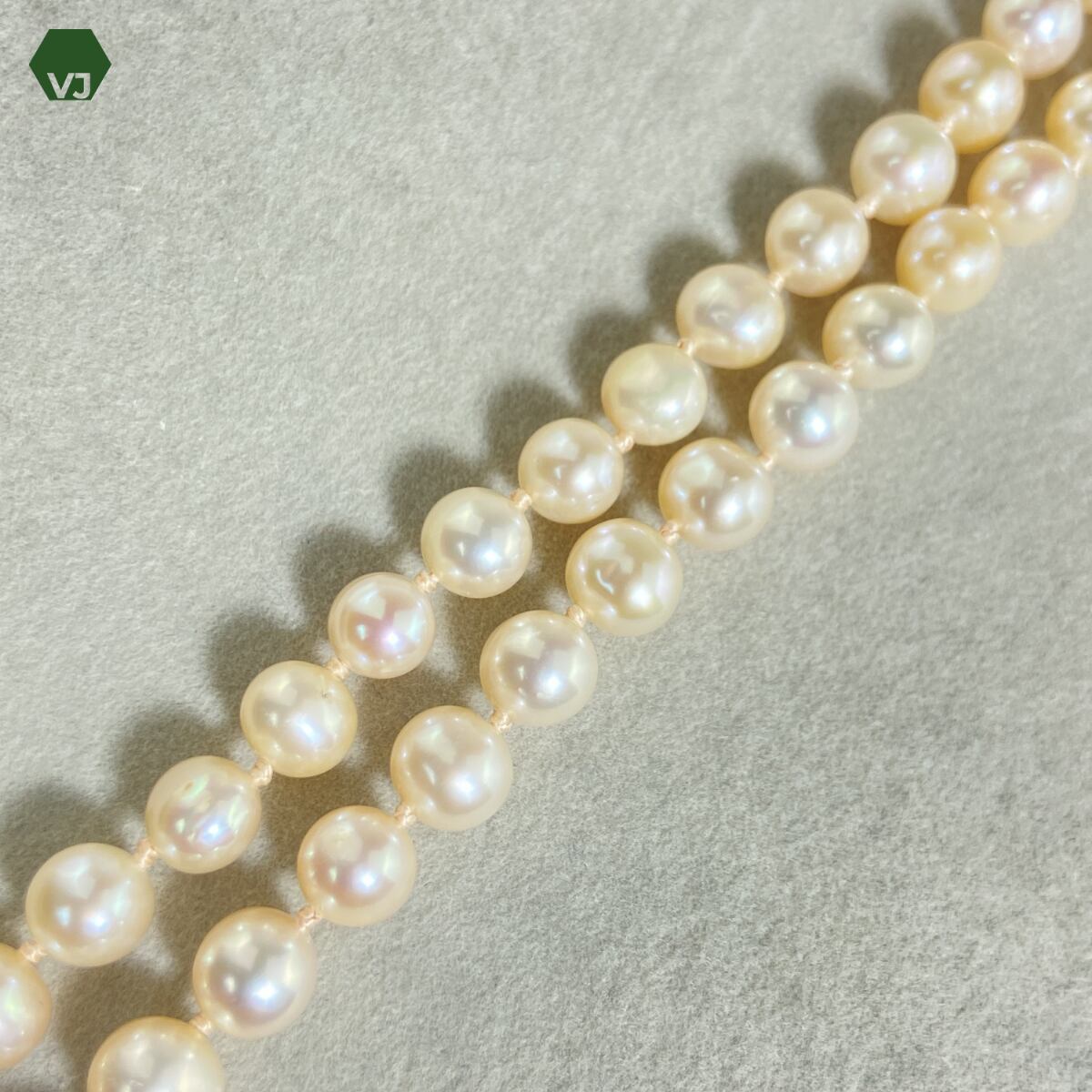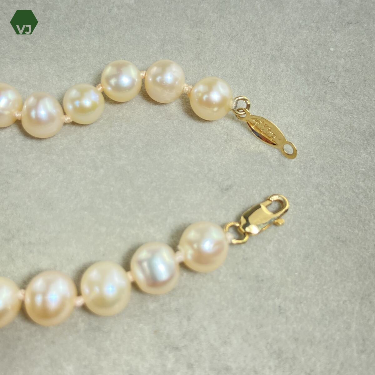 落ち着いた照りを持つ約6.1mmのパールを贅沢に連ね、K14イエローゴールドを使用した上品でクラシカルな一本に仕上がっています。