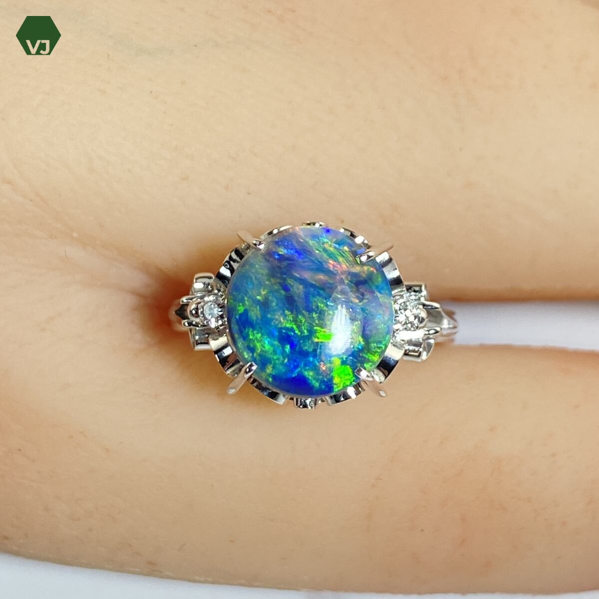 角度によって表情を変えるブラックオパール特有の遊色効果が美しく、深いブルー・グリーン系の輝きが指元で幻想的に浮かび上がります。