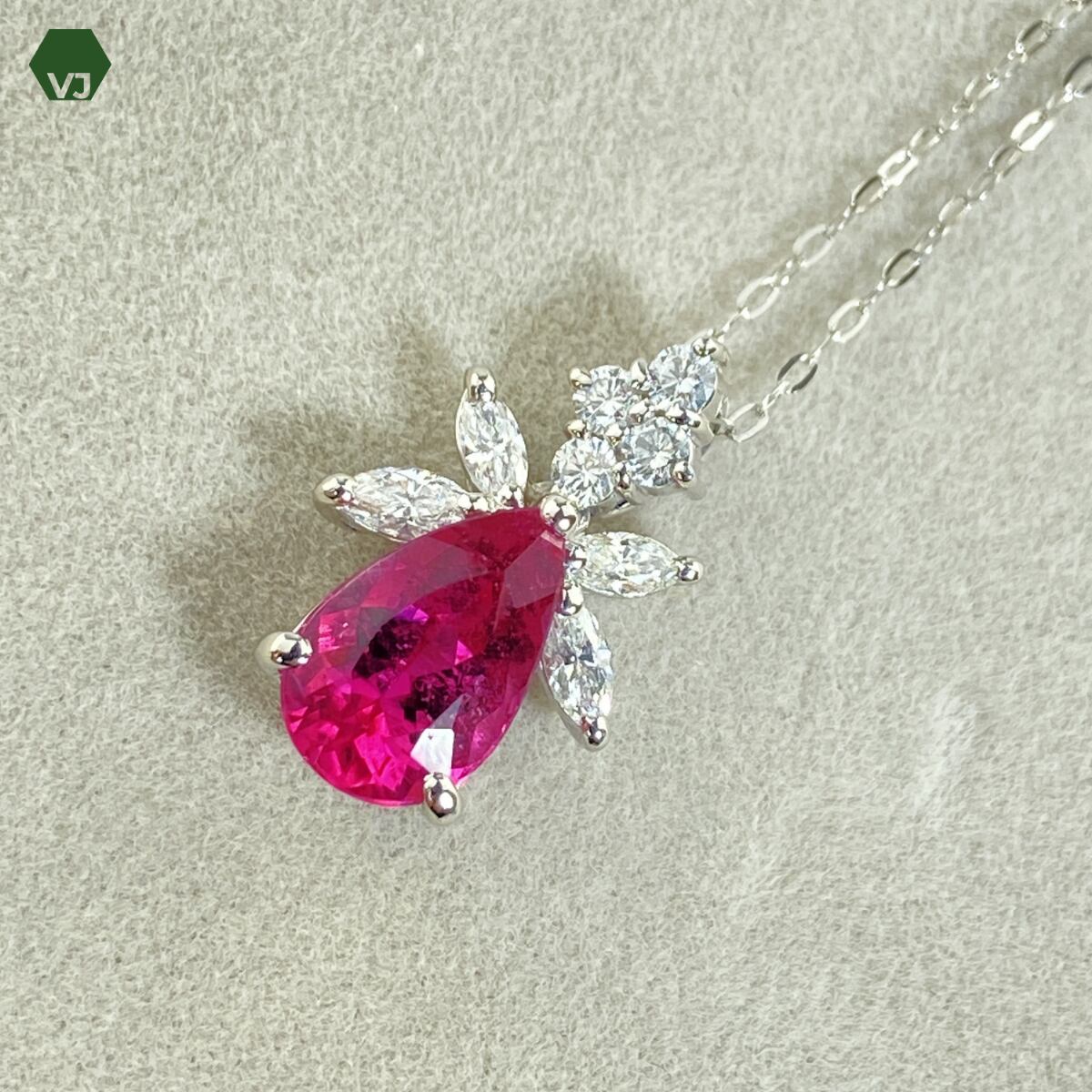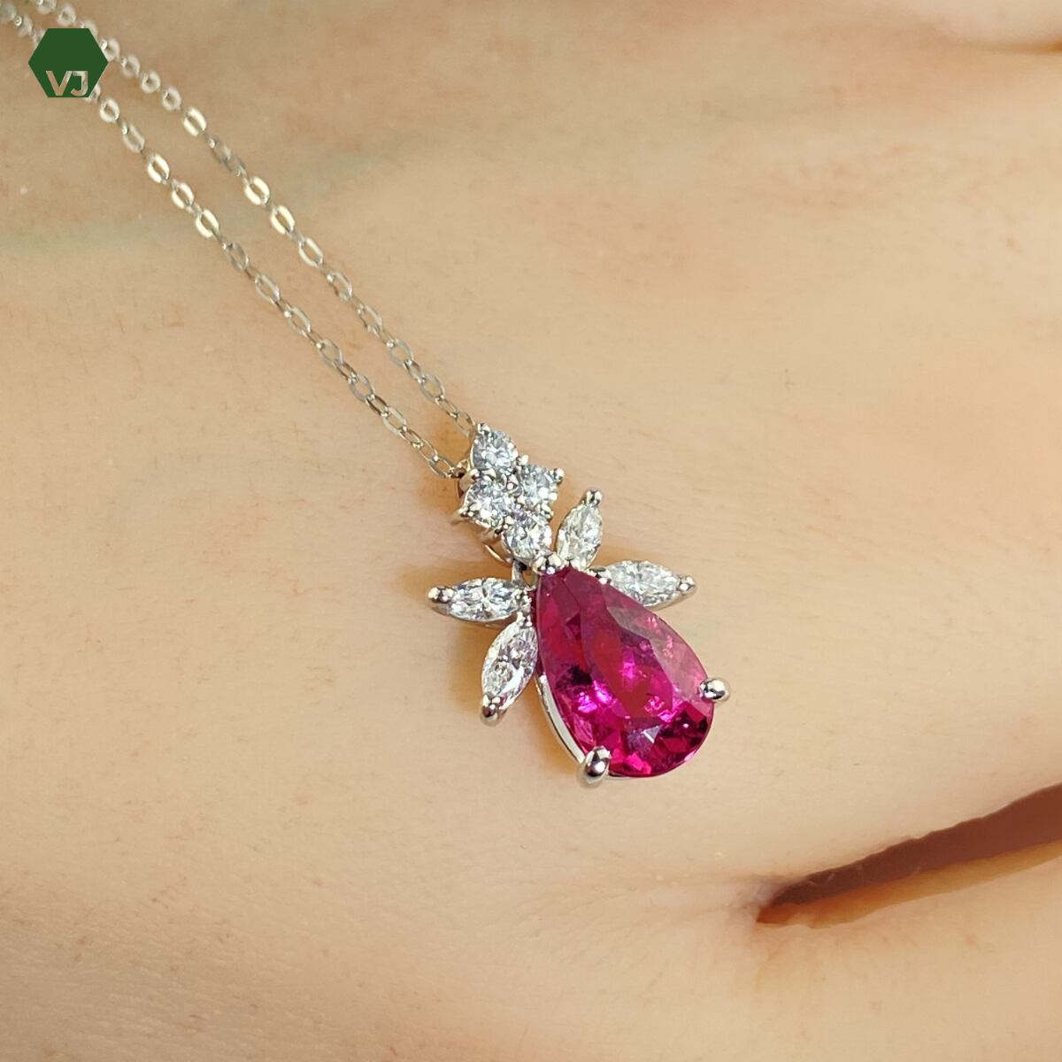 鮮やかなピンクレッドの輝きが魅力のルベライトを主石にあしらった、華やかなダイヤモンドネックレスでございます。
