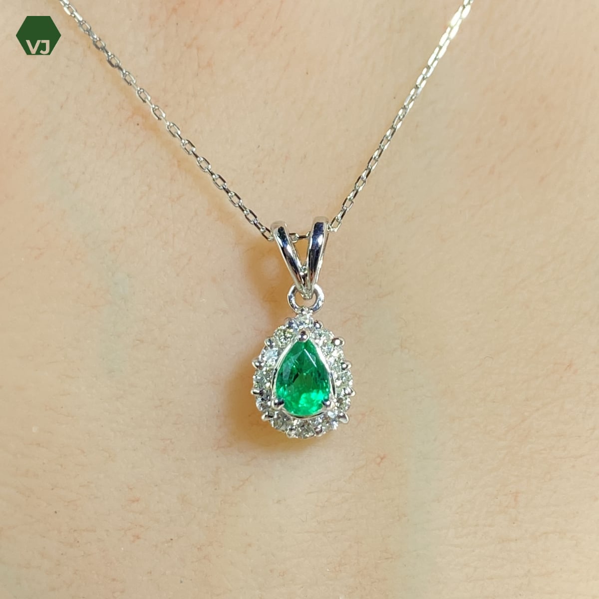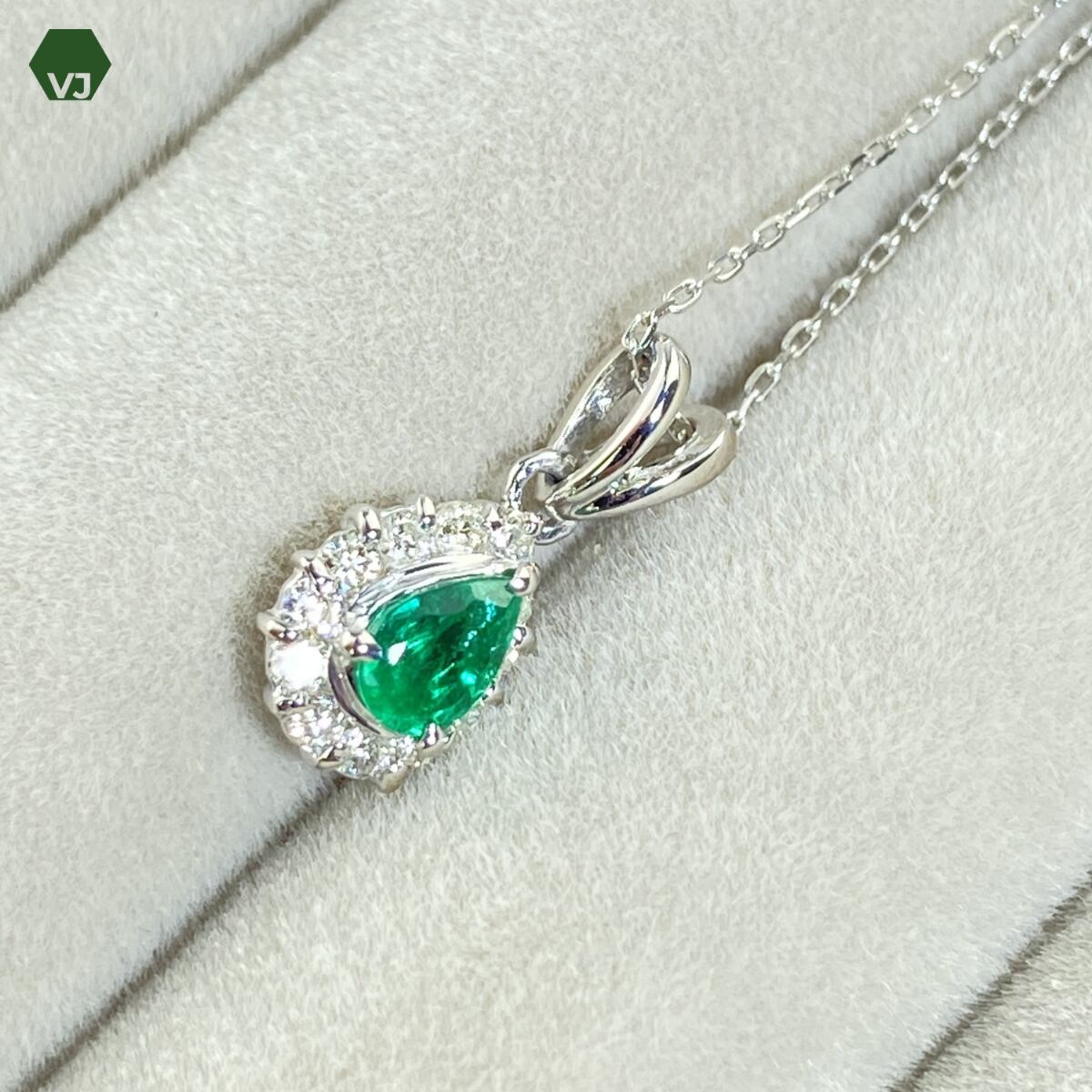 鮮やかなグリーンの輝きが魅力のエメラルドを主石にあしらった、上品なダイヤモンドネックレスでございます。
