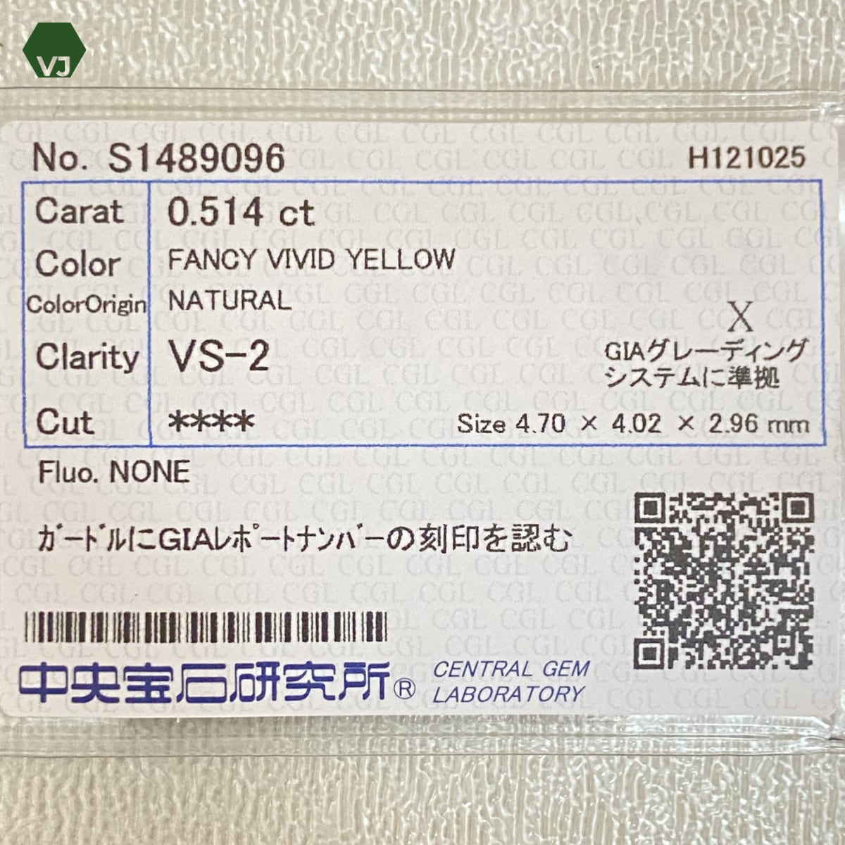 ✔ Fancy Vivid Yellow ダイヤモンド 0.514ct