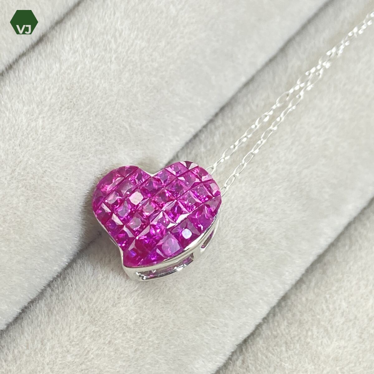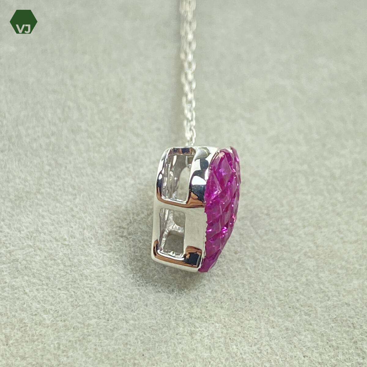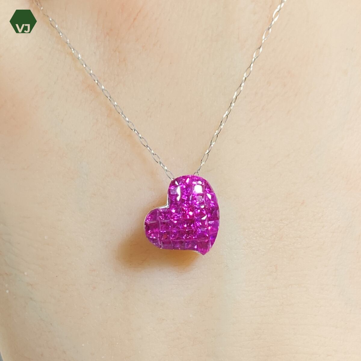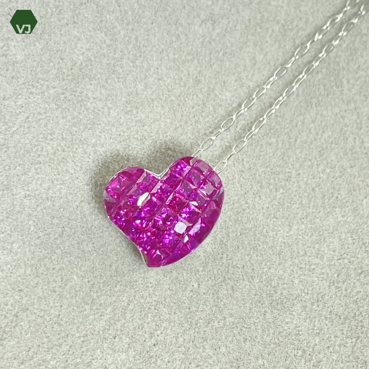 鮮やかなピンクレッドの輝きが印象的な、ハートモチーフのルビーネックレスでございます。