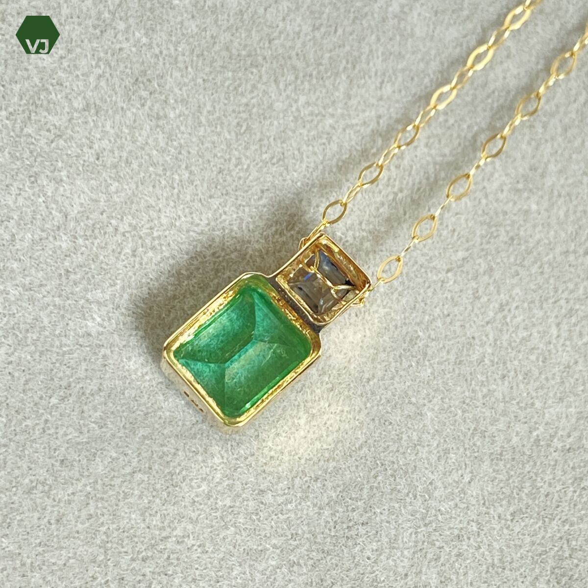 エメラルドカットならではの落ち着いた輝きと透明感が魅力で、深みのあるグリーンが胸元を上品に彩ります。