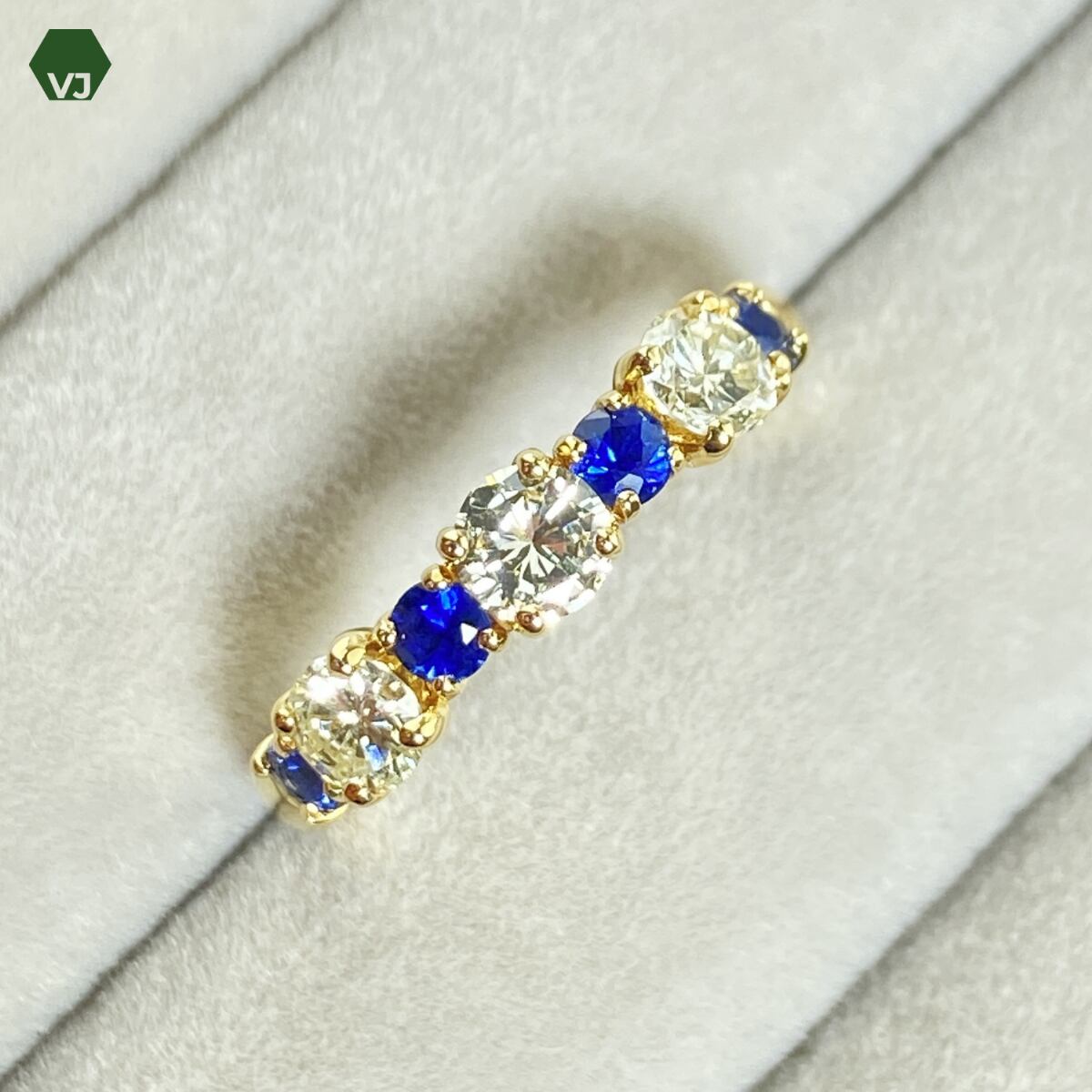 K18イエローゴールドの温かみある色味が、サファイアのブルーとダイヤモンドの煌めきを引き立て、クラシカルで高級感のある印象に仕上がっております。
