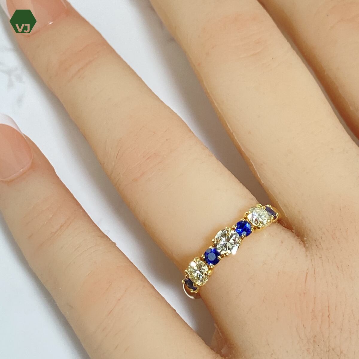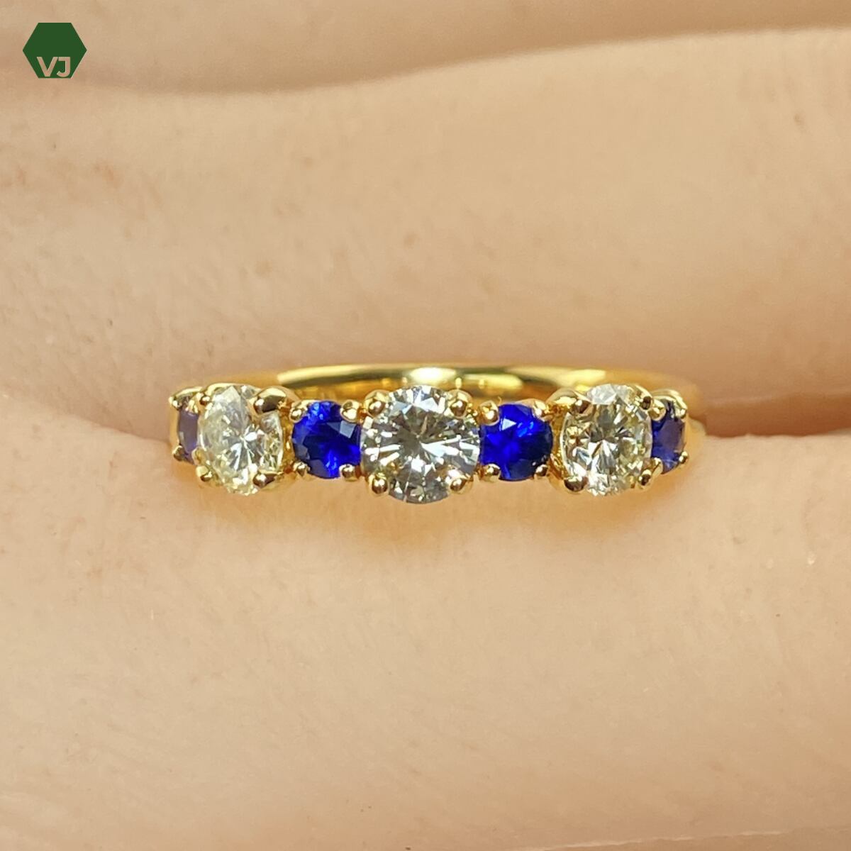 複数のサファイアとダイヤモンドを組み合わせた、華やかでバランスの良いデザインリングでございます。