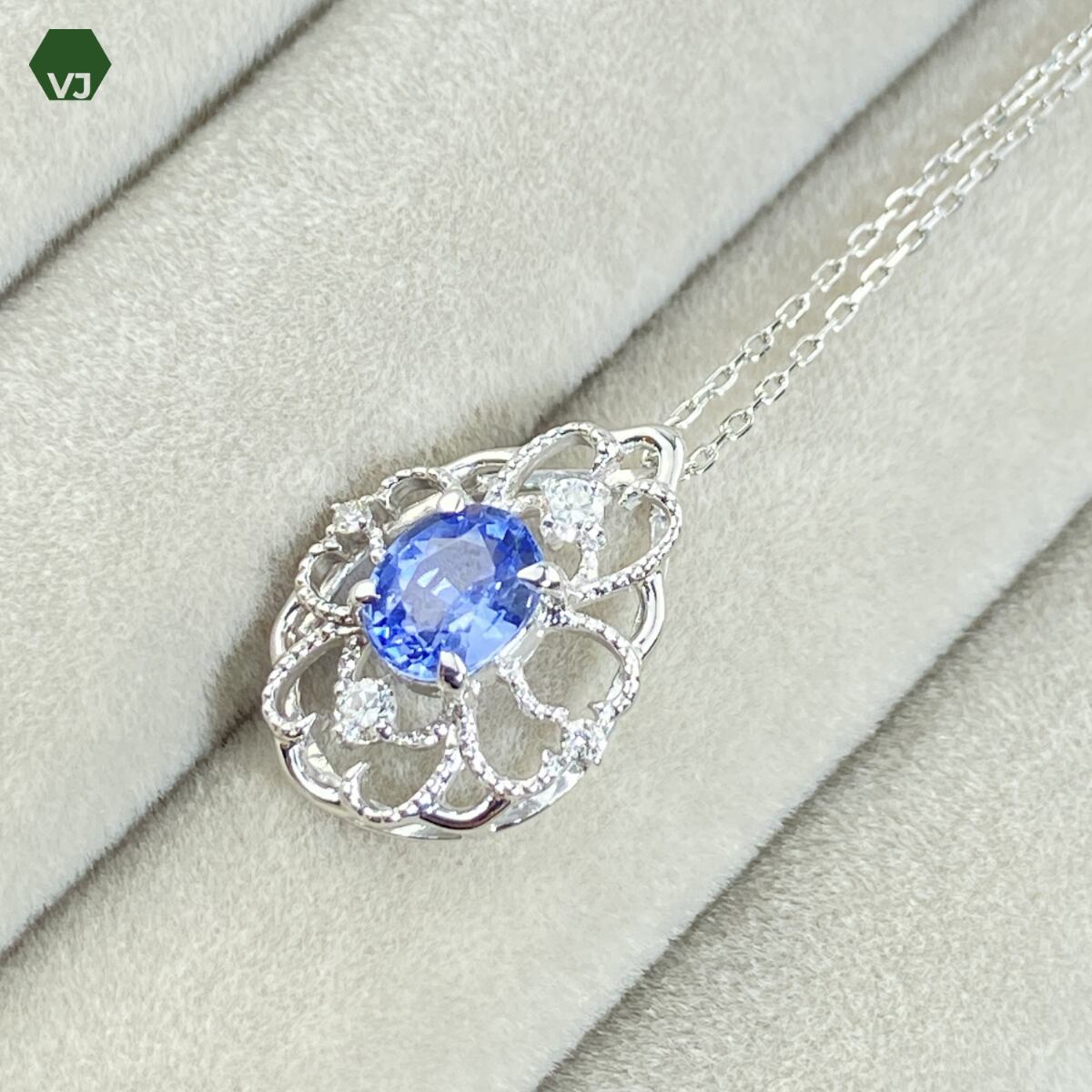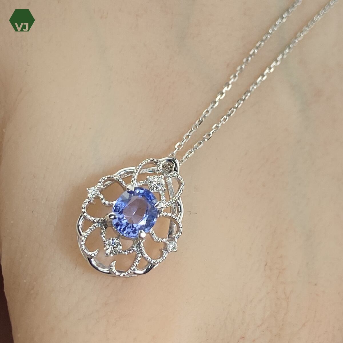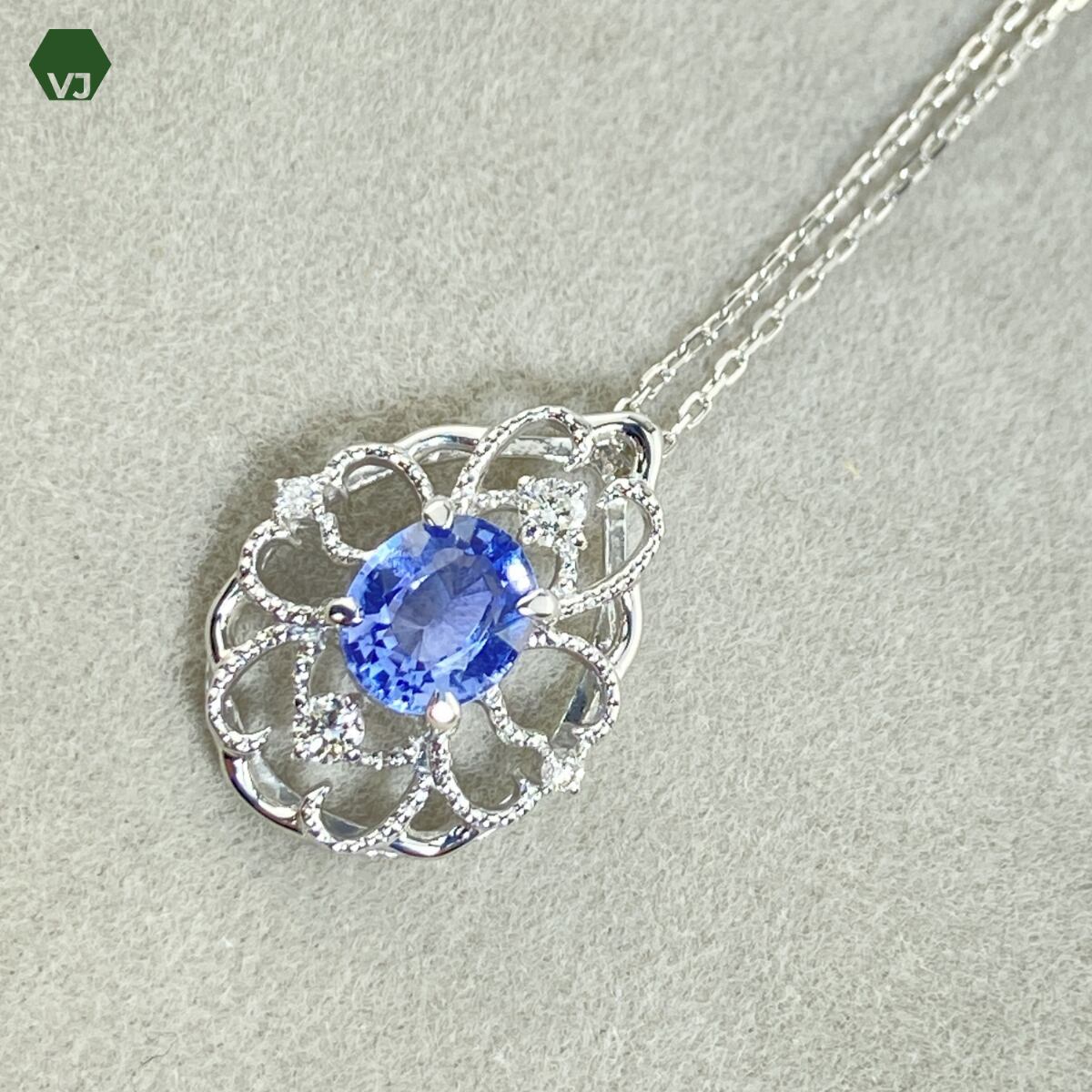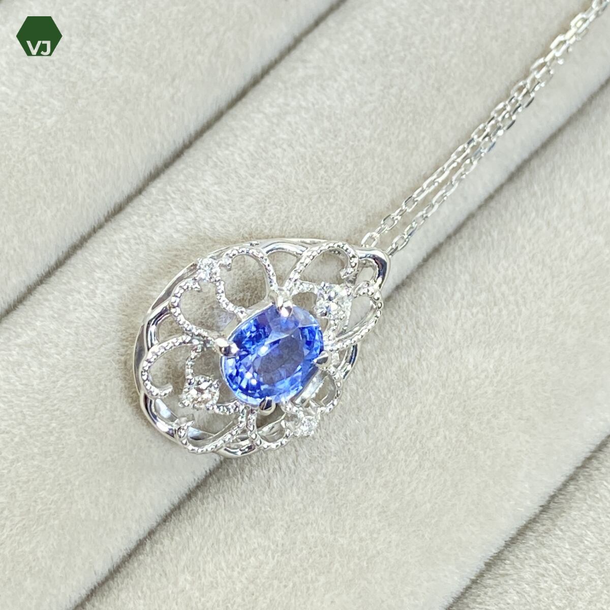 淡い紫色に近い優しい色合いが印象的なサファイアをあしらった、上品で優美なネックレスでございます。