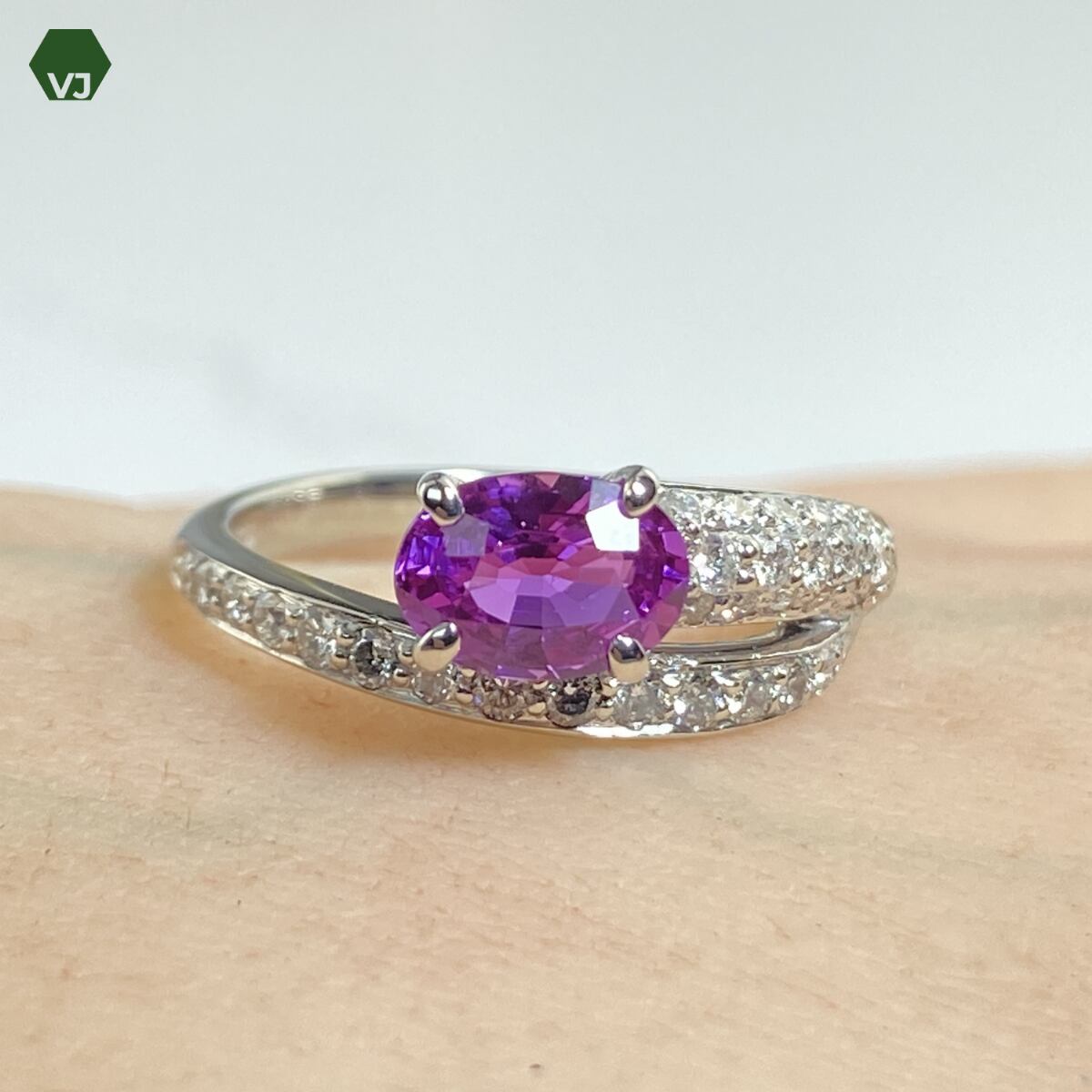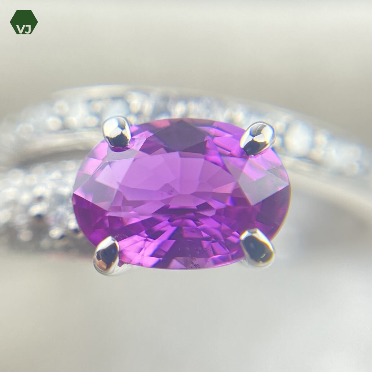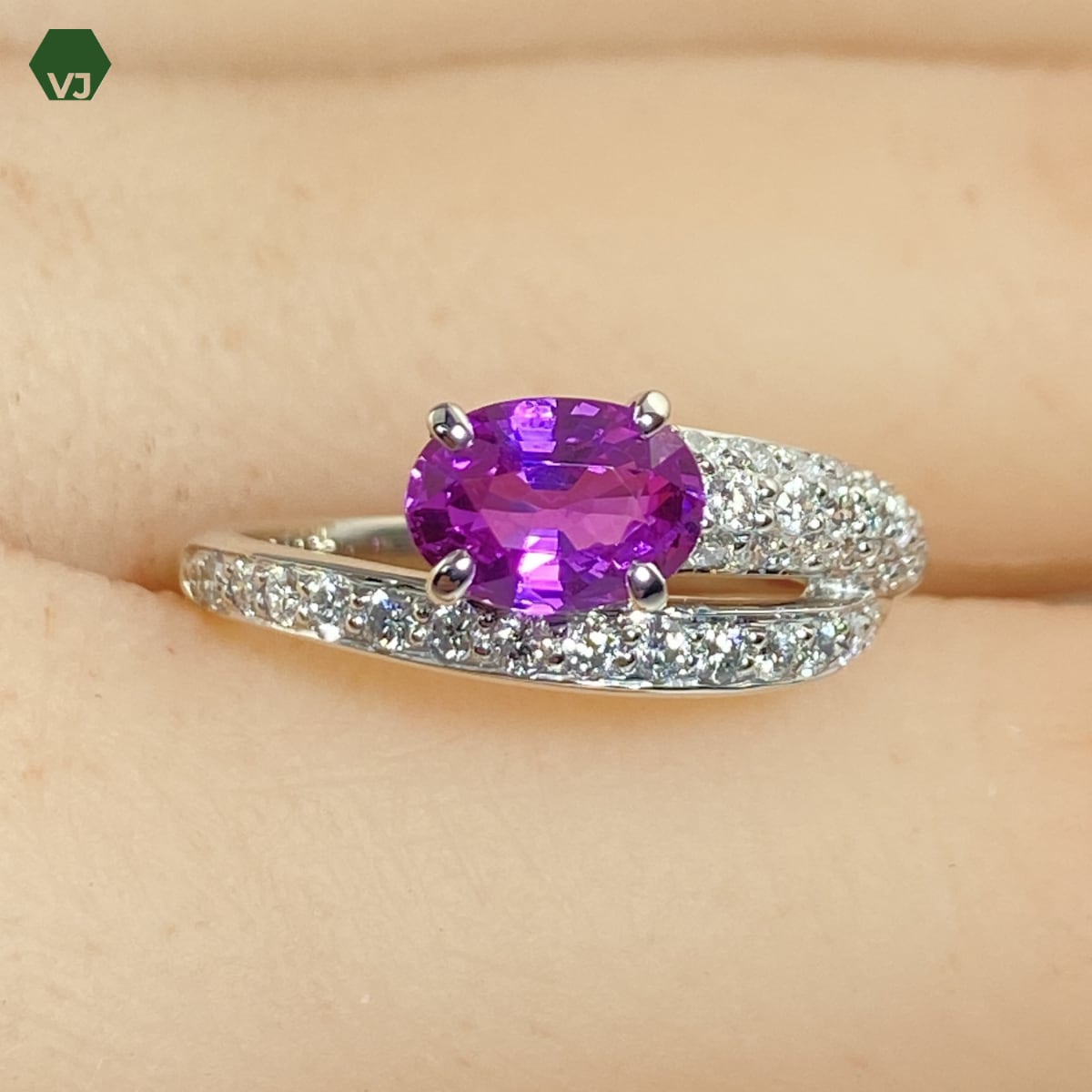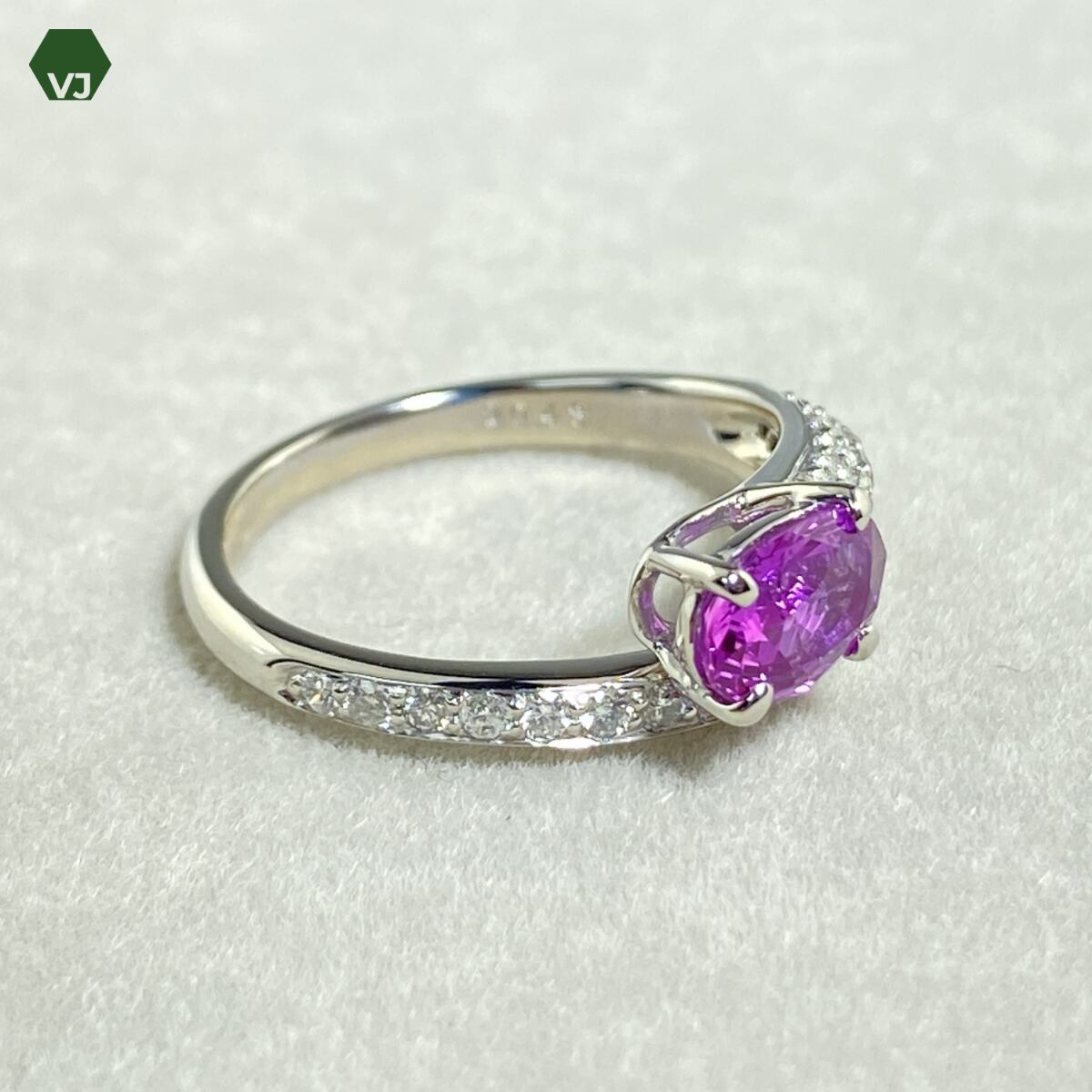 センターには1.05ctのパープルサファイアをセッティング。ややピンク味を感じる明るいパープルカラーが美しく、透明感と発色の良さが際立つ一石です。