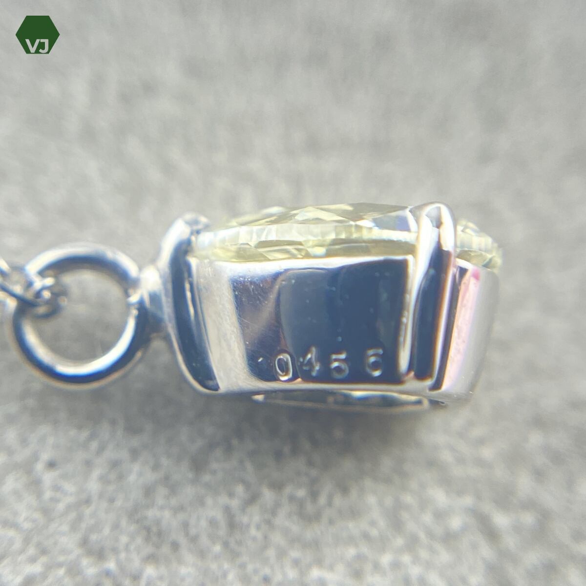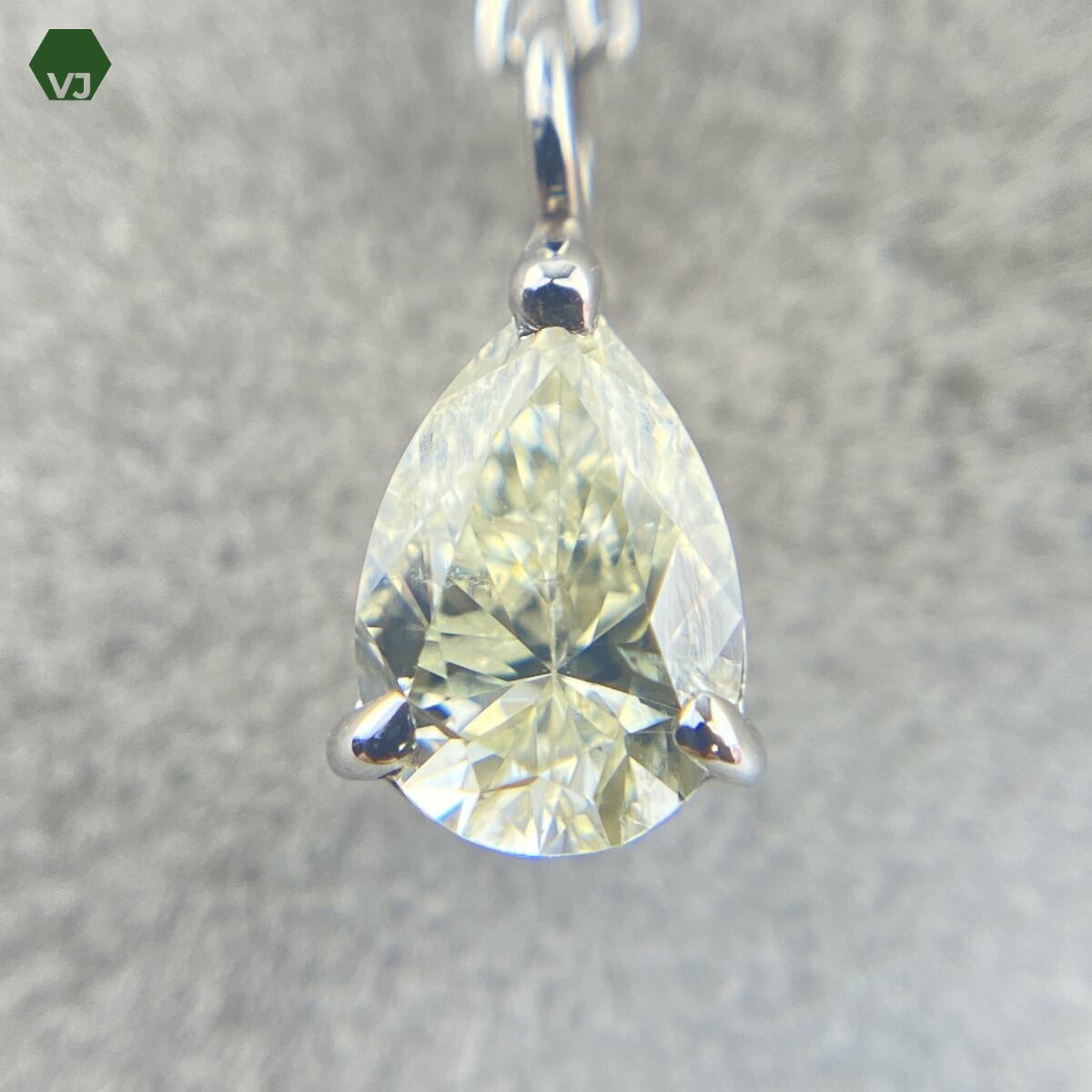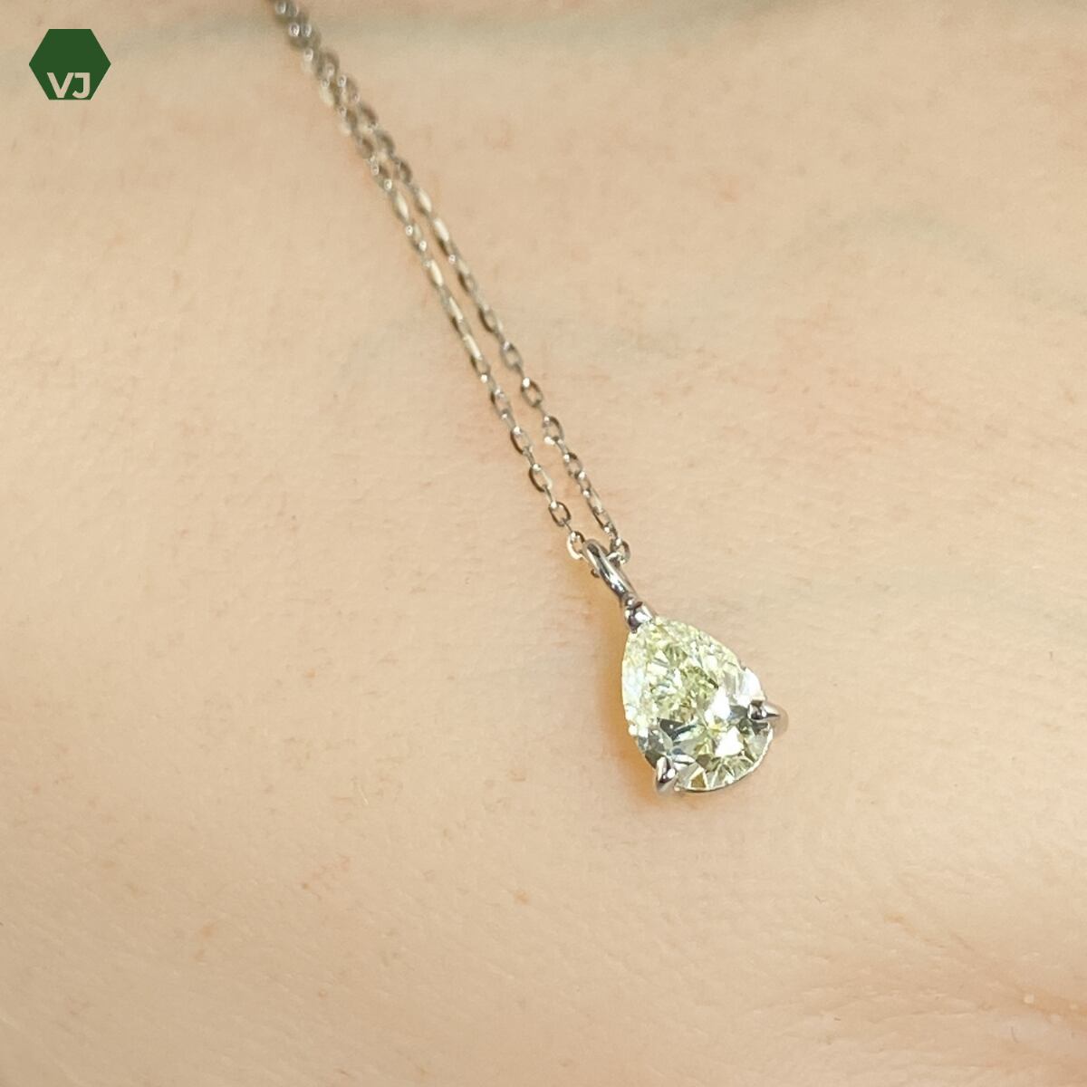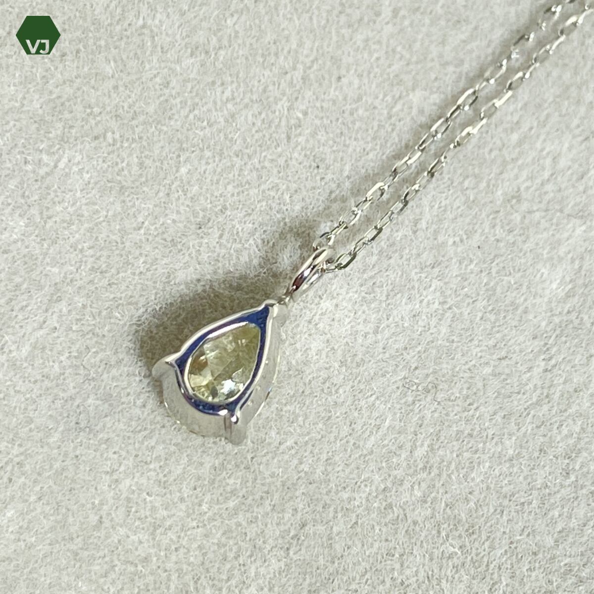 センターにはペアシェイプ(ティアドロップ)カットのダイヤモンド0.456ctをセッティング。やわらかなフォルムと流れるようなシルエットが女性らしさを引き立て、胸元に上品な印象を与えます。