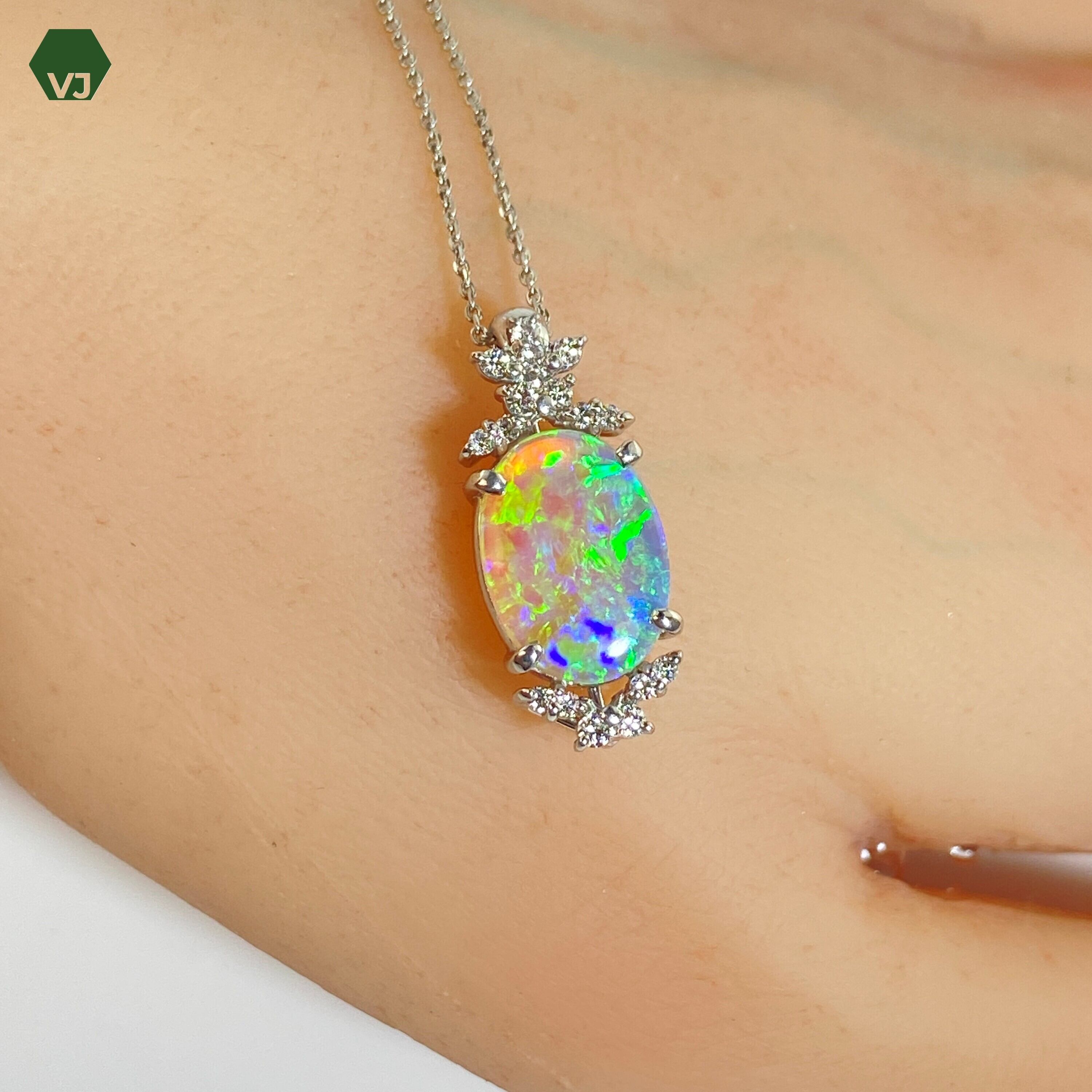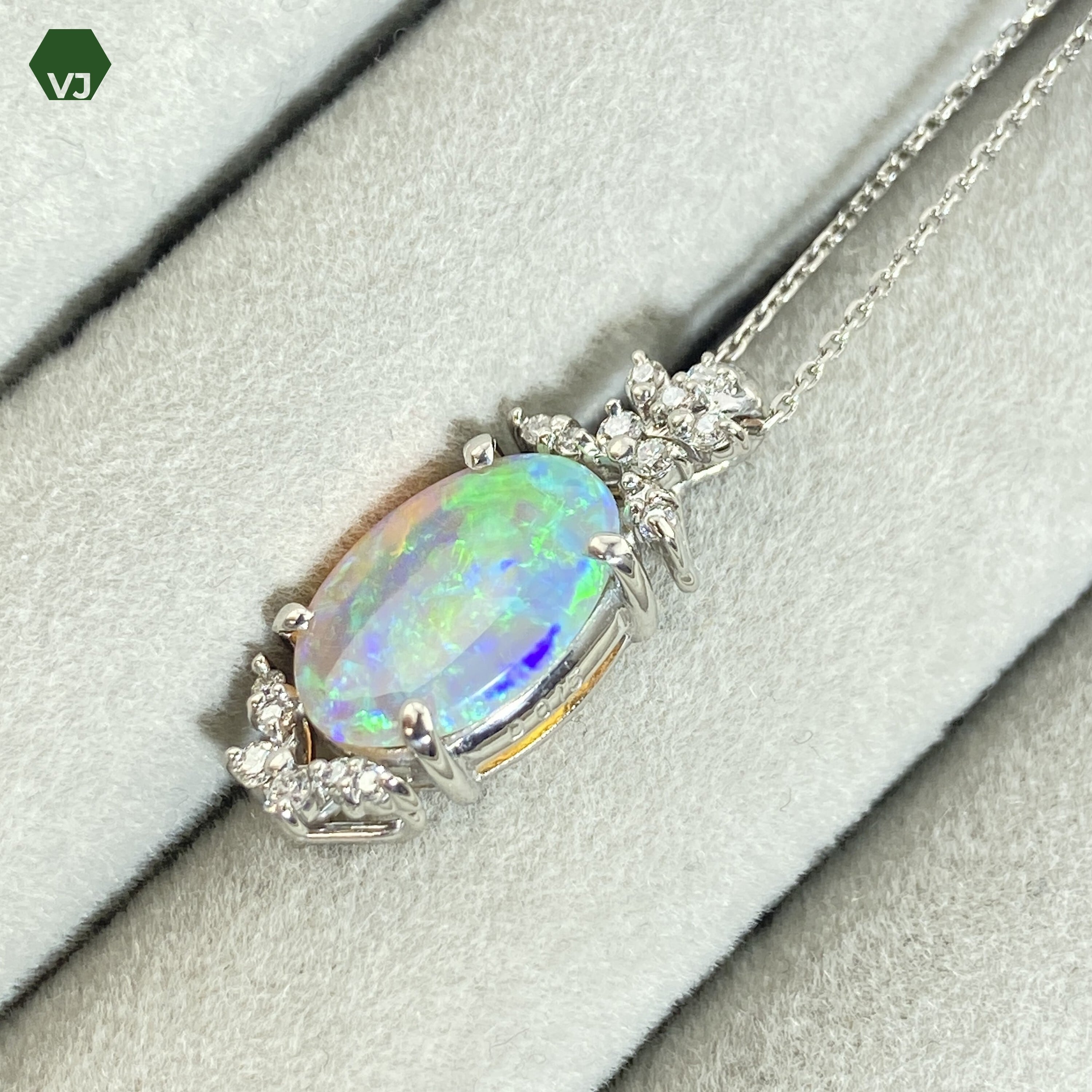 オパールとダイヤモンドの輝きが美しい、上質なネックレス。一粒のダイヤモンドが煌めき、オパールの神秘的な色彩が華やかさをプラスしてくれます。高級感漂うプラチナ素材で仕上げられた、上質なジュエリーです。