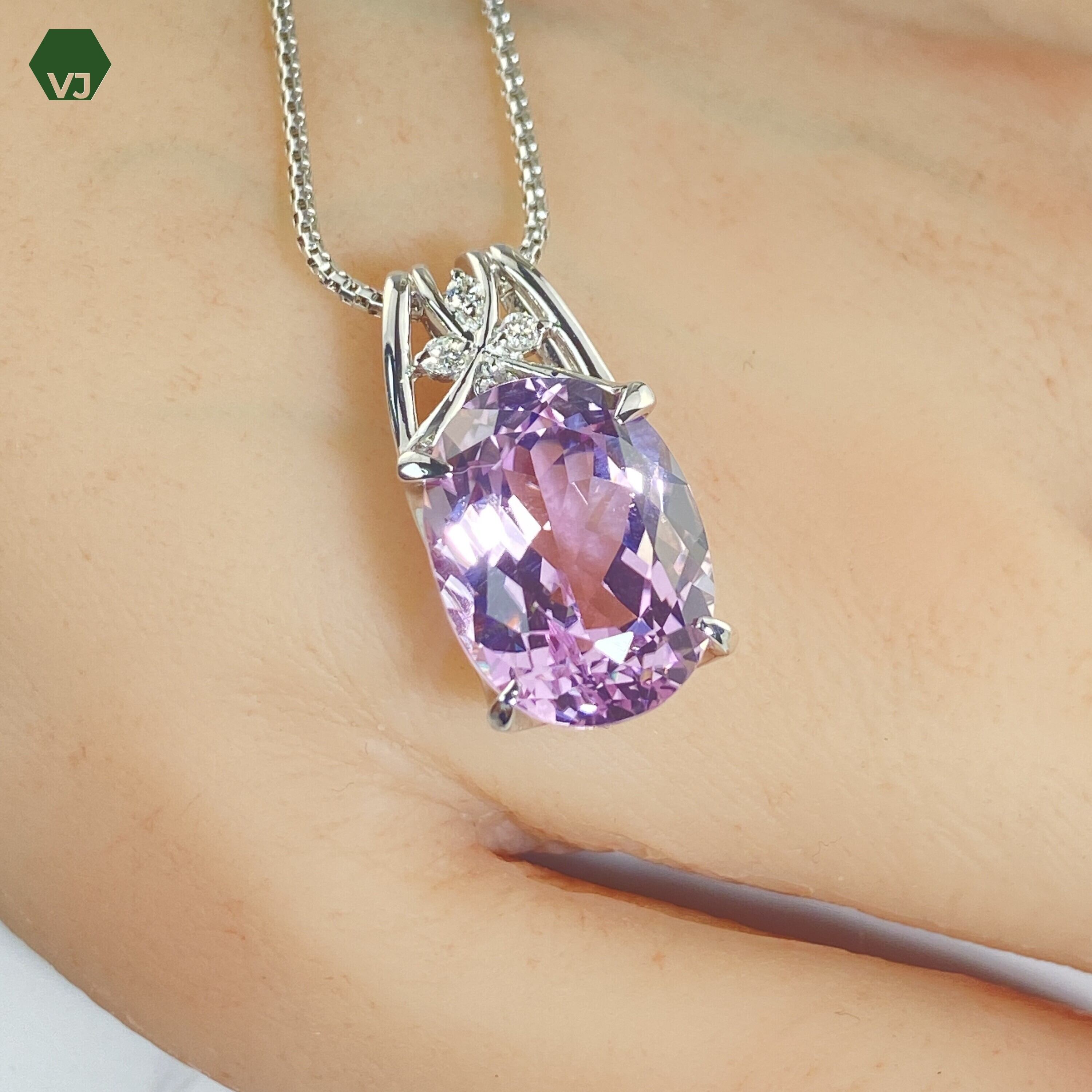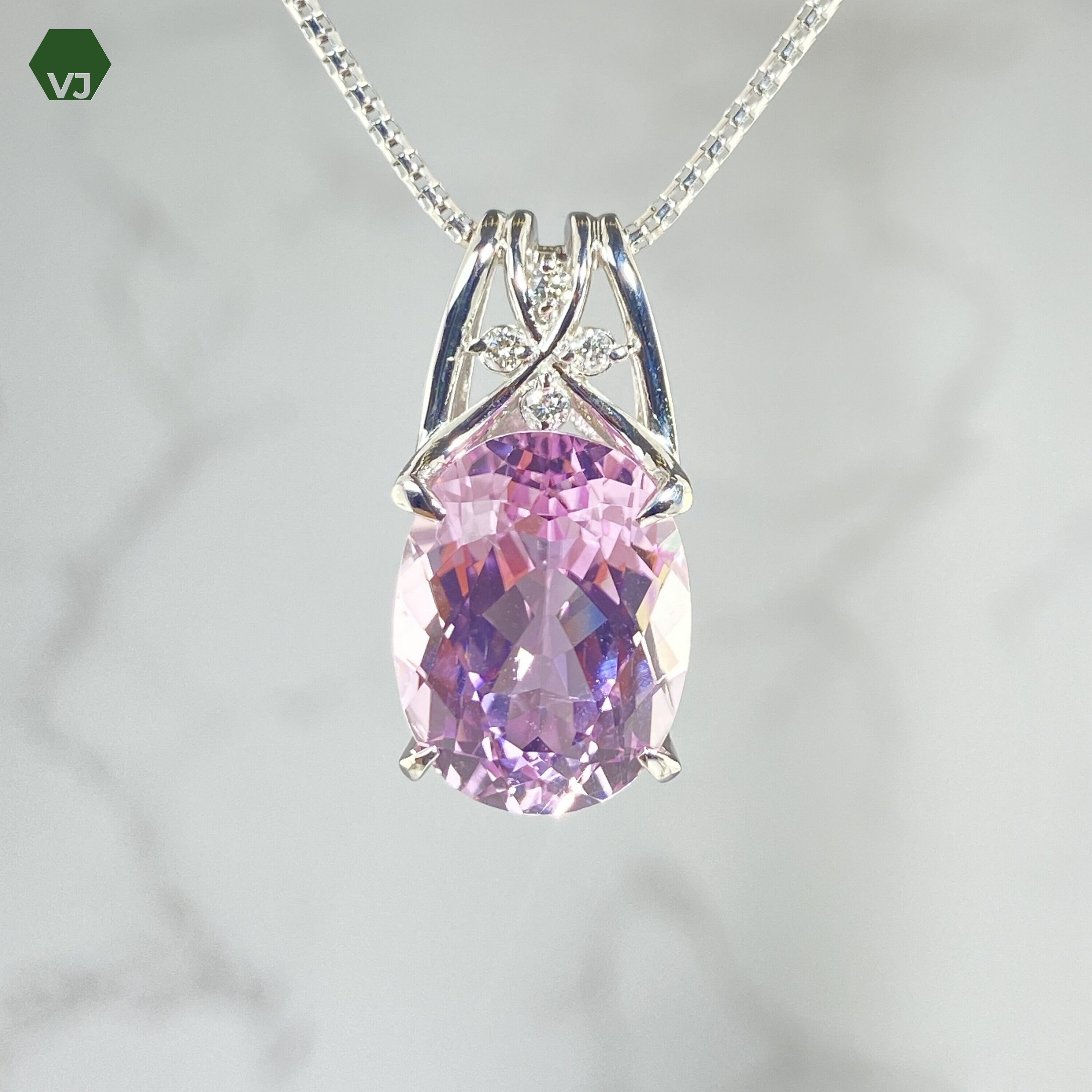 クンツァイトと輝くダイヤモンドが贅沢に使用された上質なネックレス。美しいピンクの宝石と輝くダイヤモンドが調和し、どんな装いにも華を添えます。11.61ctのクンツァイトが放つ優雅な輝きは、まるで夢のような上質さを演出します。