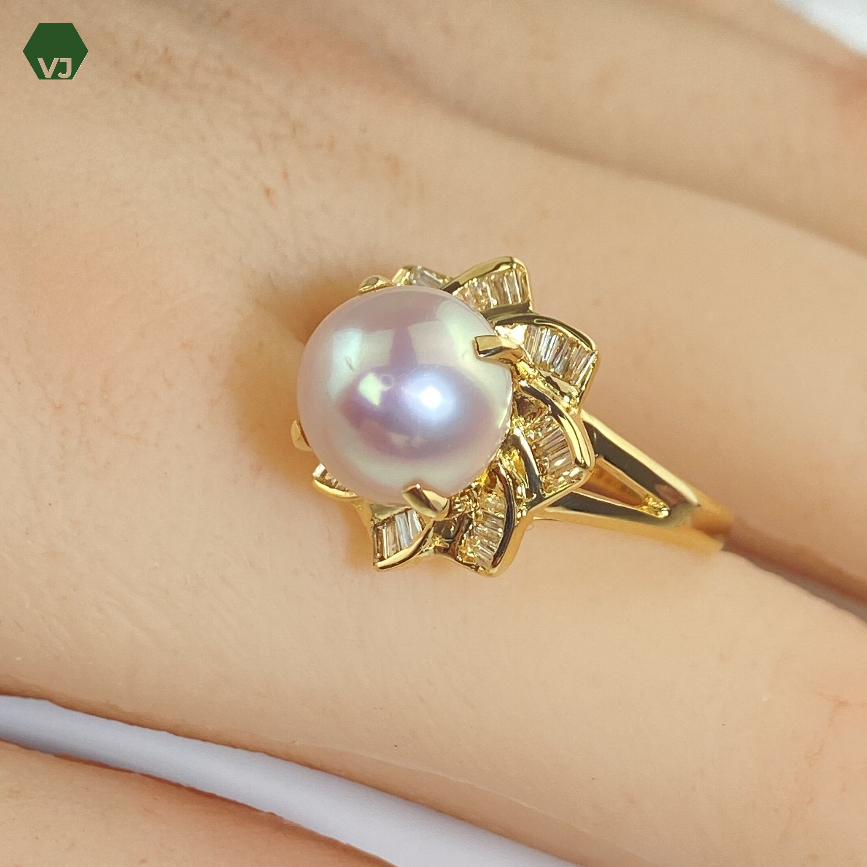 上品なパールと輝くダイヤモンドが施された、K18YG製のリング。