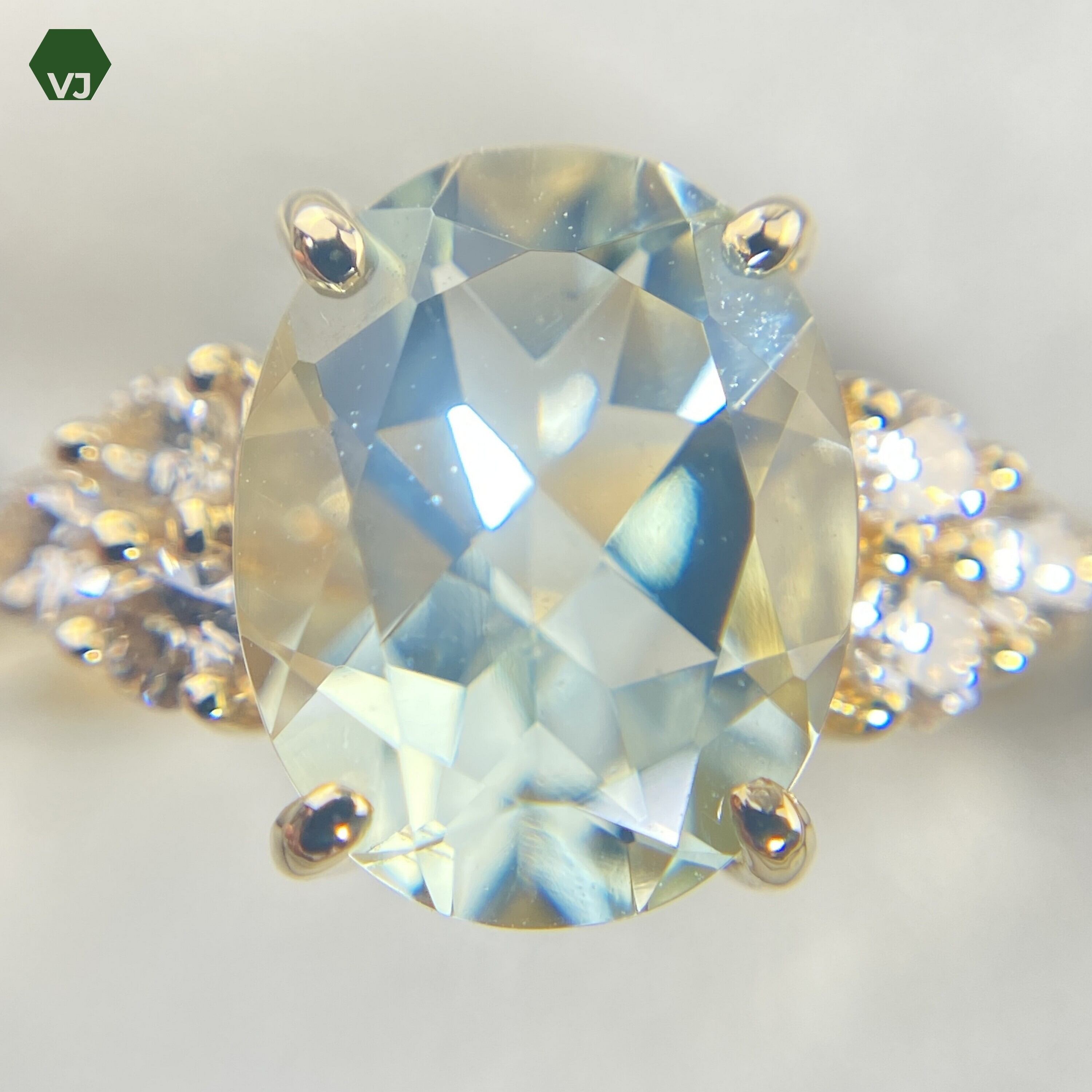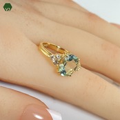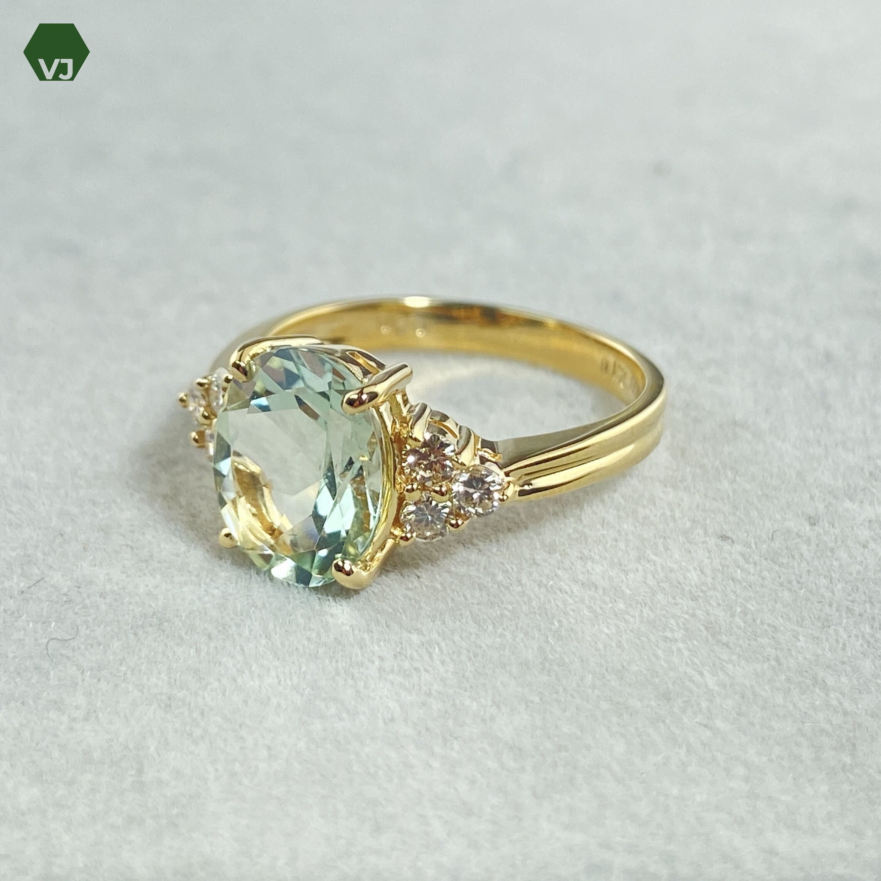 上品なグリーンアメジストと輝くダイヤモンドが贅沢に使用されたエレガントなリング。