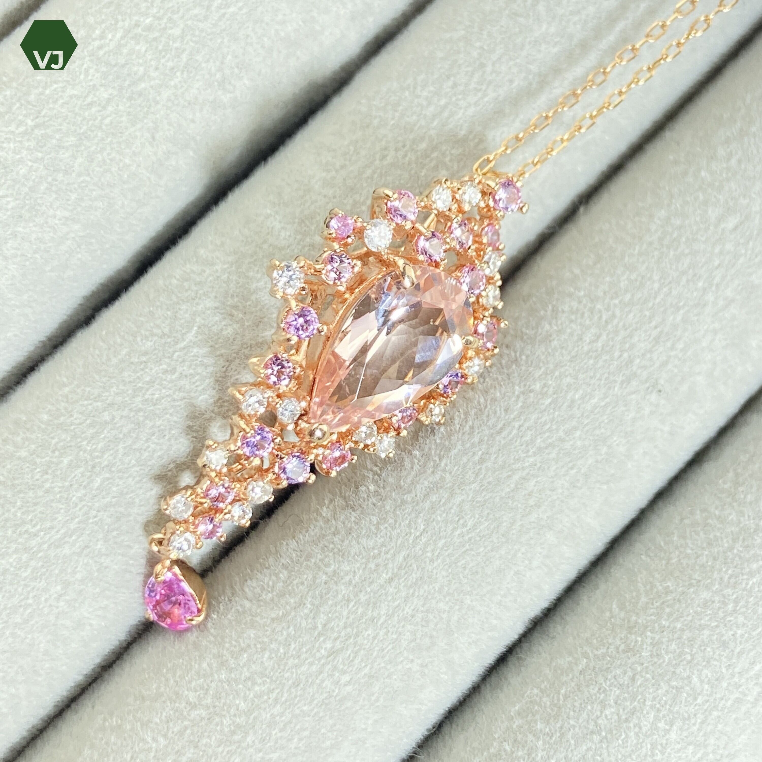 輝く美しさを放つモルガナイト、サファイア、ダイヤモンドのネックレス。1.63カラットの魅惑的なモルガナイトが、0.56カラットのサファイアと0.2カラットの輝くダイヤモンドと調和しています。K18PG素材のチェーンは、長さ45㎝と程よい長さで、エレガントな輝きを身に纏います。