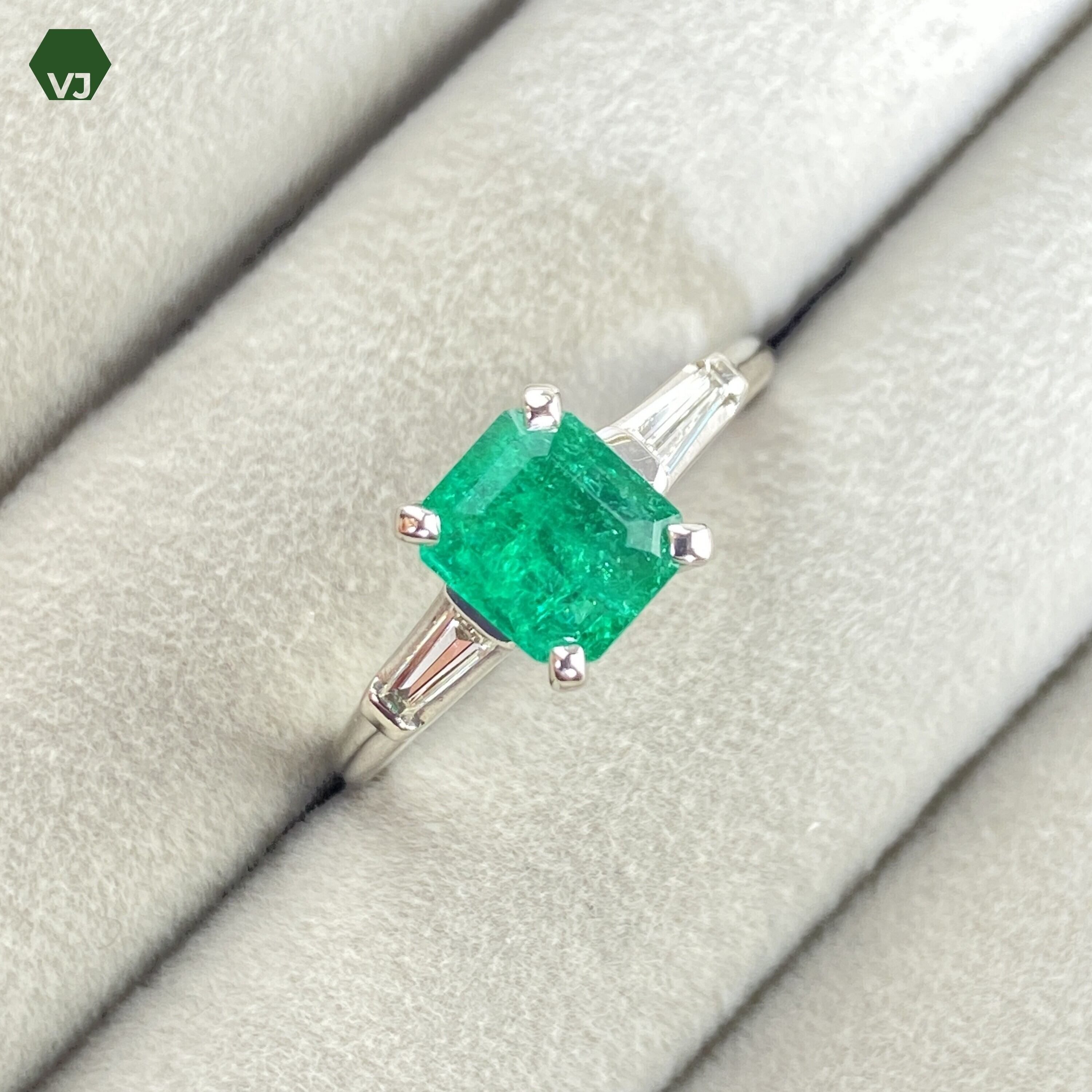 エメラルドとダイヤモンドの輝きが美しい、プラチナリング。一粒のエメラルドが上品な輝きを放ち、周囲を取り囲むダイヤモンドがさらに華やかさを引き立てます。15号というサイズ感も指元を美しく演出し、存在感抜群のジュエリーとしてお使いいただけます。
